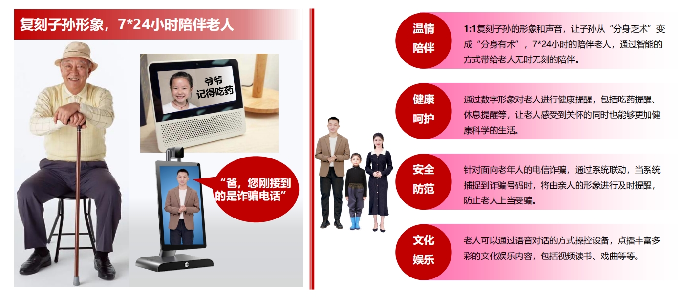 1.以子孫形象陪伴老人,信息化方式呵護(hù)老人。復(fù)刻子孫形象聲音,以親切的方式陪伴老人,并提供健康、安全、文化娛樂(lè)等豐富服務(wù),通過(guò)智慧化的方式呵護(hù)老人,幫助老年人跨越數(shù)字鴻溝,安享晚年生活。